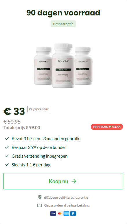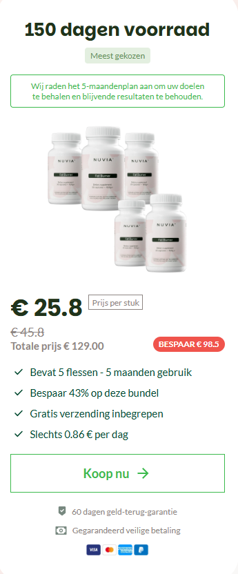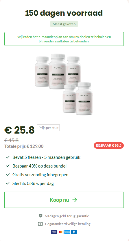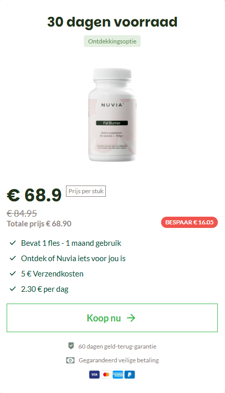 Voor extra zekerheid wordt Nuvia geleverd met een 60 dagen 100% geld-terug-garantie. Je kunt het zonder risico proberen en zelf beoordelen. Als je geen duidelijke verbetering merkt in energie, stofwisseling of gewichtsbeheer, kun je een volledige terugbetaling aanvragen — zonder vragen.